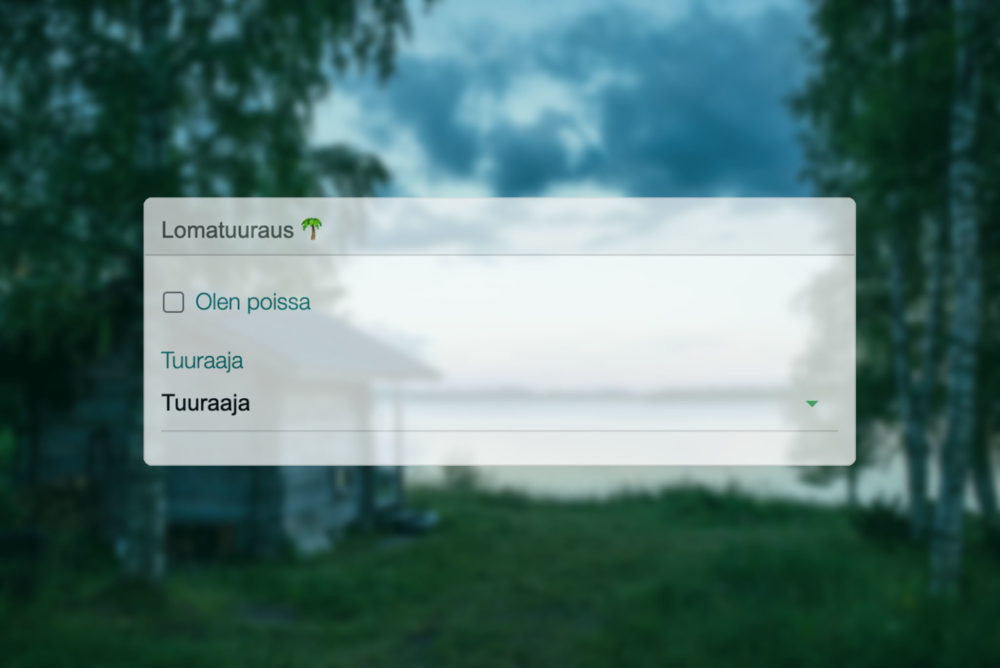 Käyttäjän asetuksista löytyy kenttä nimeltä Loma-asetukset josta tulee loman alkaessa aktivoida Olen poissa -kenttä sekä valita Tuuraaja-kenttään tuuraajana toimivan henkilön nimi.