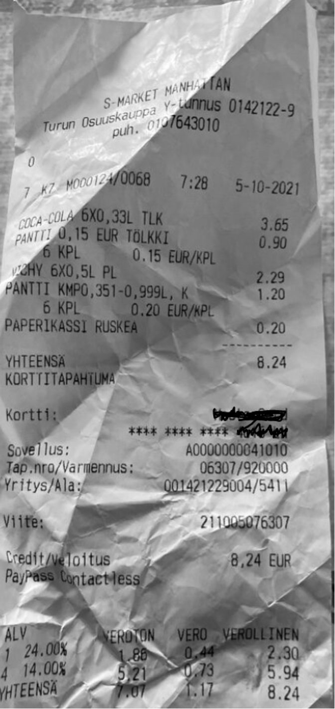 Kuitti sisältää Suomen arvonlisäveron, joka on pääsääntöisesti vähennyskelpoista