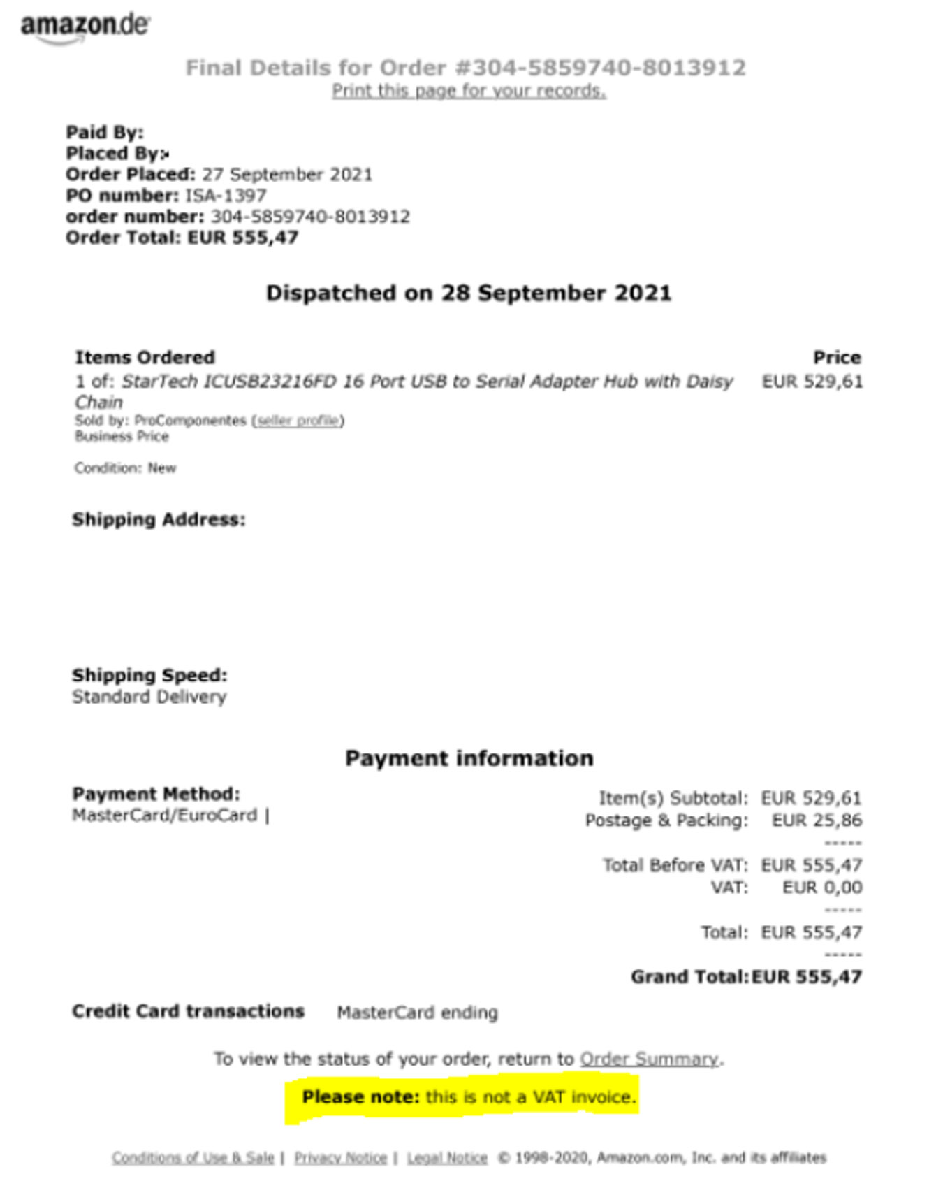 Joissakin EU-maasta tehdyissä hankinnoissa (esim. Amazon) lukee tilausvahvistuksessa erikseen: ”Please note: this is not a VAT invoice”.