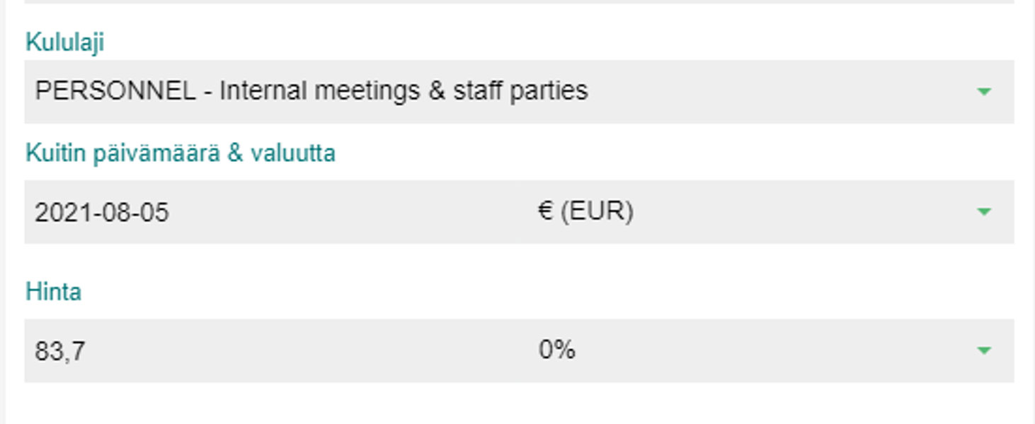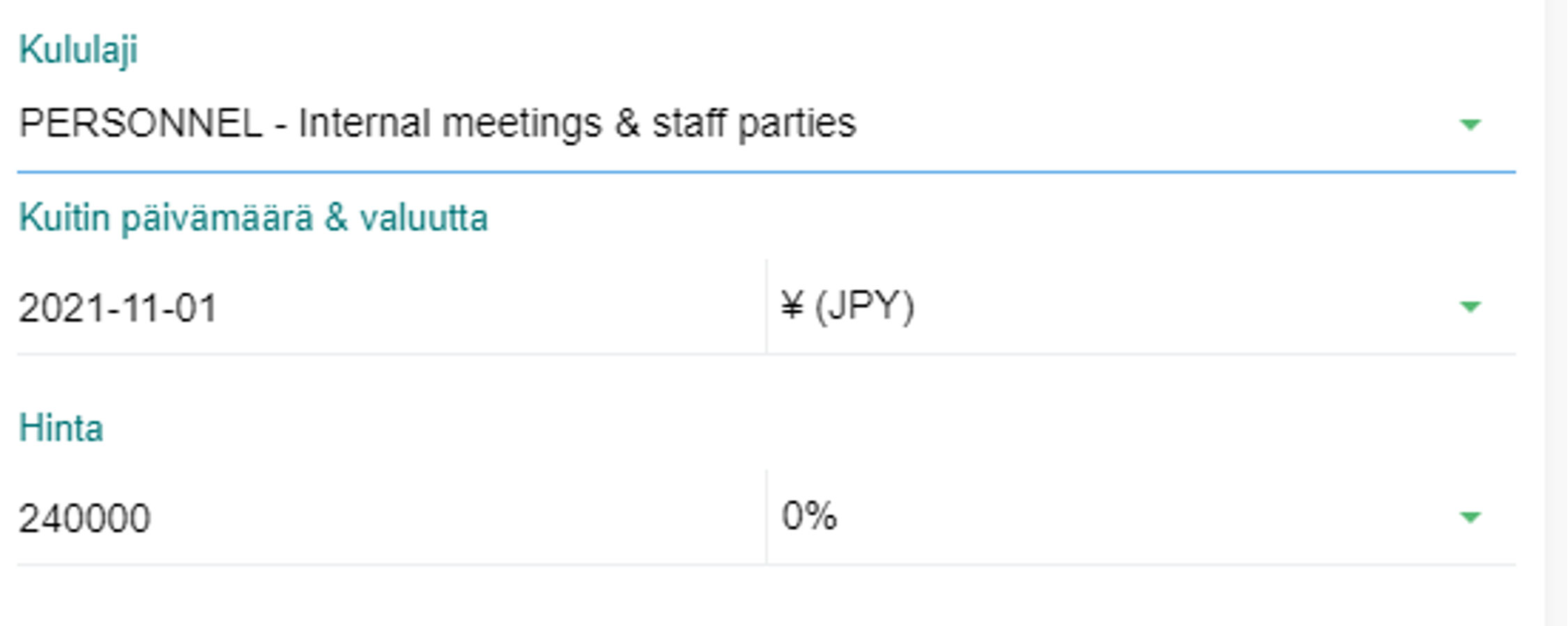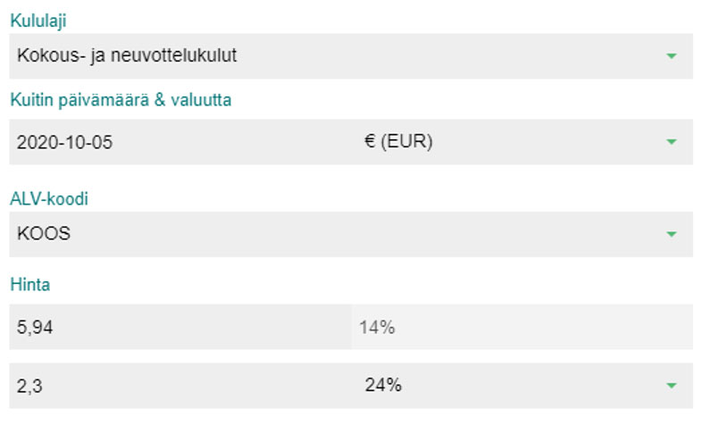 - alv-prosentiksi laitetaan 0, koska kuitin sisältämä ALV ei ole Suomessa vähennyskelpoista