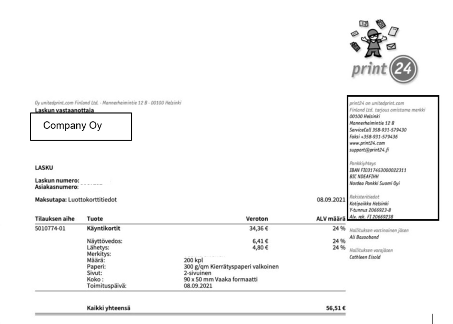 Tilaus on hyvä tehdä yrityksen nimissä, vaikka osto maksettaisiin henkilökohtaisella (luotto)kortilla.
