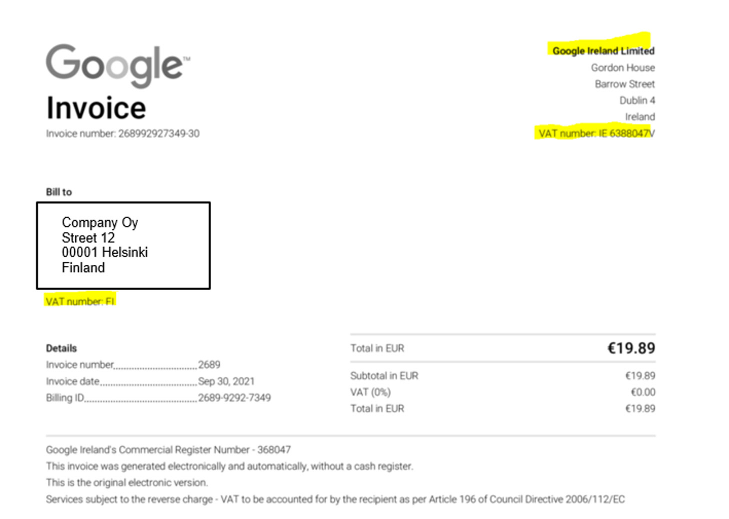 Hyvä esimerkki (myyjän nimi ja VAT-tunnus näkyvissä, ostajana henkilö (eikä yritys), mutta yrityksen VAT-tunnus näkyy):