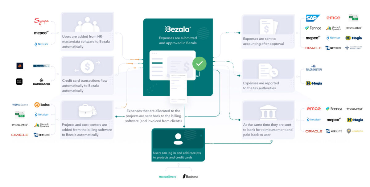 Bezala on mahdollista yhdistää kaikkiin yleisimpiin talous- ja henkilöstöhallinnon ohjelmistoihin. Lisäksi yleisimmät luottokortit ovat yhdistettävissä Bezalaan. Tutustu integraatioihin.