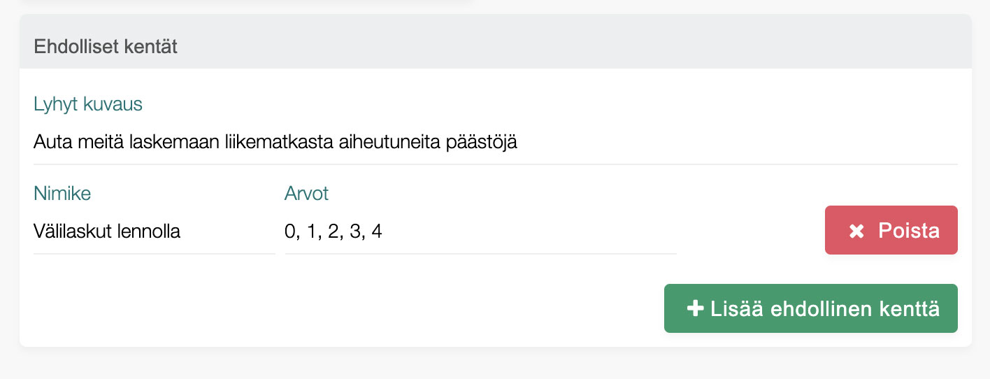 Voit lisätä kululajikohtaisia lisäkenttiä kululajien asetuksista. Kutsumme näitä kenttiä ehdollisiksi kentiksi, sillä kenttien näkymisen ehtona on, että käyttäjä valitsee tietyn kululajin.