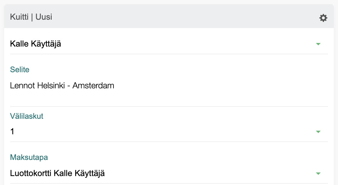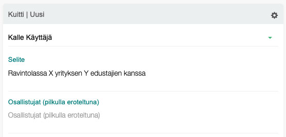 Voit nyt valita osallistujien merkitseminen pakollisesti haluamillesi kululajeille. Tällainen kulaji voisi olla esimerkiksi edustuskulu. Tällöin käyttäjän valittua kyseisen kululajin kuittilomakkeelle ilmestyy uusi kenttä ”Osallistujat”.