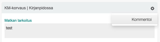 Kommentti ei siirry kirjanpitoon asti vaan tarkoituksena on antaa mahdollisuus kommentoida kulua tai kulun lisäämistä, esimerkiksi ”valitse seuraavalla kerralla juna” tai ”merkitse tämä seuraavalla kerralla kululajille Edustuskulut” tms.