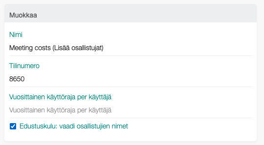 Osallistujat-kentän voi ottaa käyttöön Maksutavat ja kululajit -sivulta muokkaamalla kululajia.