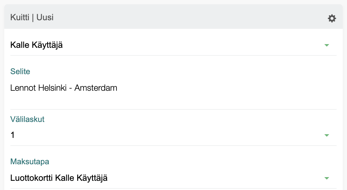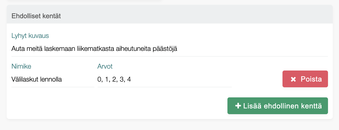 Autamme keräämään päästölaskentaan käytettävää tietoa ehdollisten kenttien avulla. Voit esimerkiksi pyytää käyttäjiä merkitsemään välilaskujen määrän kun kululajiksi valitaan lennot, hotelliöiden määrän kun kululajiksi valitaan hotellit jne.
