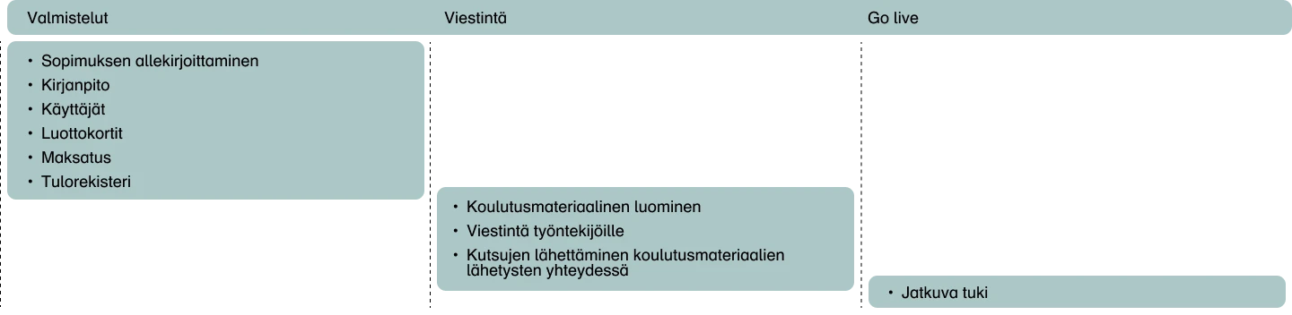 Käyttöönoton laajuus ja roolijako riippuvat organisaation koosta ja käyttöön tulevista integraatioista.