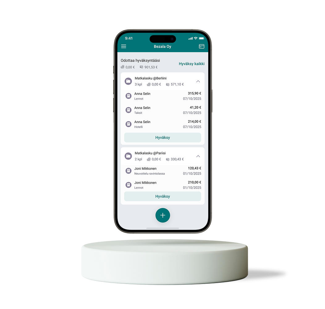 Bezala-mobiilisovelluksella luot matkalaskut käden käänteessä. Voit lisätä matkalaskulle useita kuluja ja hyväksyjä voi hyväksyä ne yhdellä klikkauksella.
