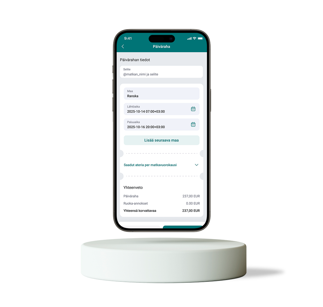 Päivärahalaskuri laskee päivärahan matkan keston, tarjottujen aterioiden ja yrityksen matkustuspolitiikan perusteella. Laskuriin voidaan tehdä maa-, TES- ja yrityskohtaisia laskentalogiikoita.