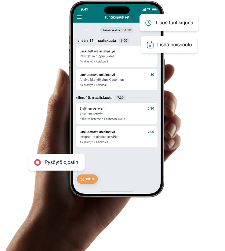 Työajanseuranta-kokonaisuus julkaistaan vuoden 2026 ensimmäisen puoliskon aikana. Seuraamalla meitä LinkedInissä kuulet julkaisusta ensimmäisten joukossa.