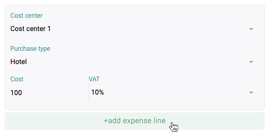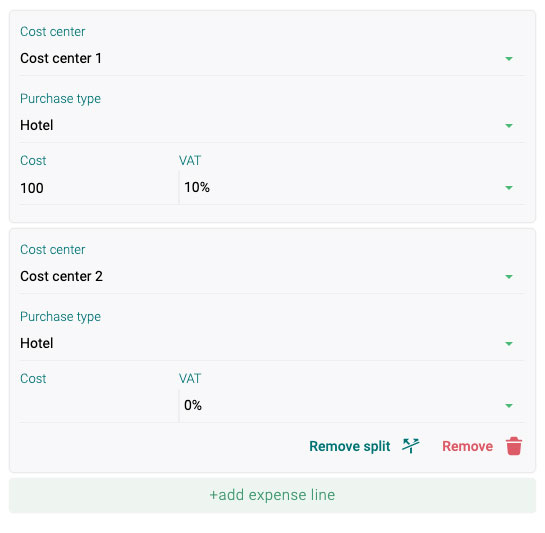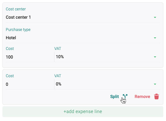 Adding a new expense line allows you to set a different VAT percentage to the line. To continue splitting receipt to multiple expense accounts and cost cost centers you have to press “Split”.